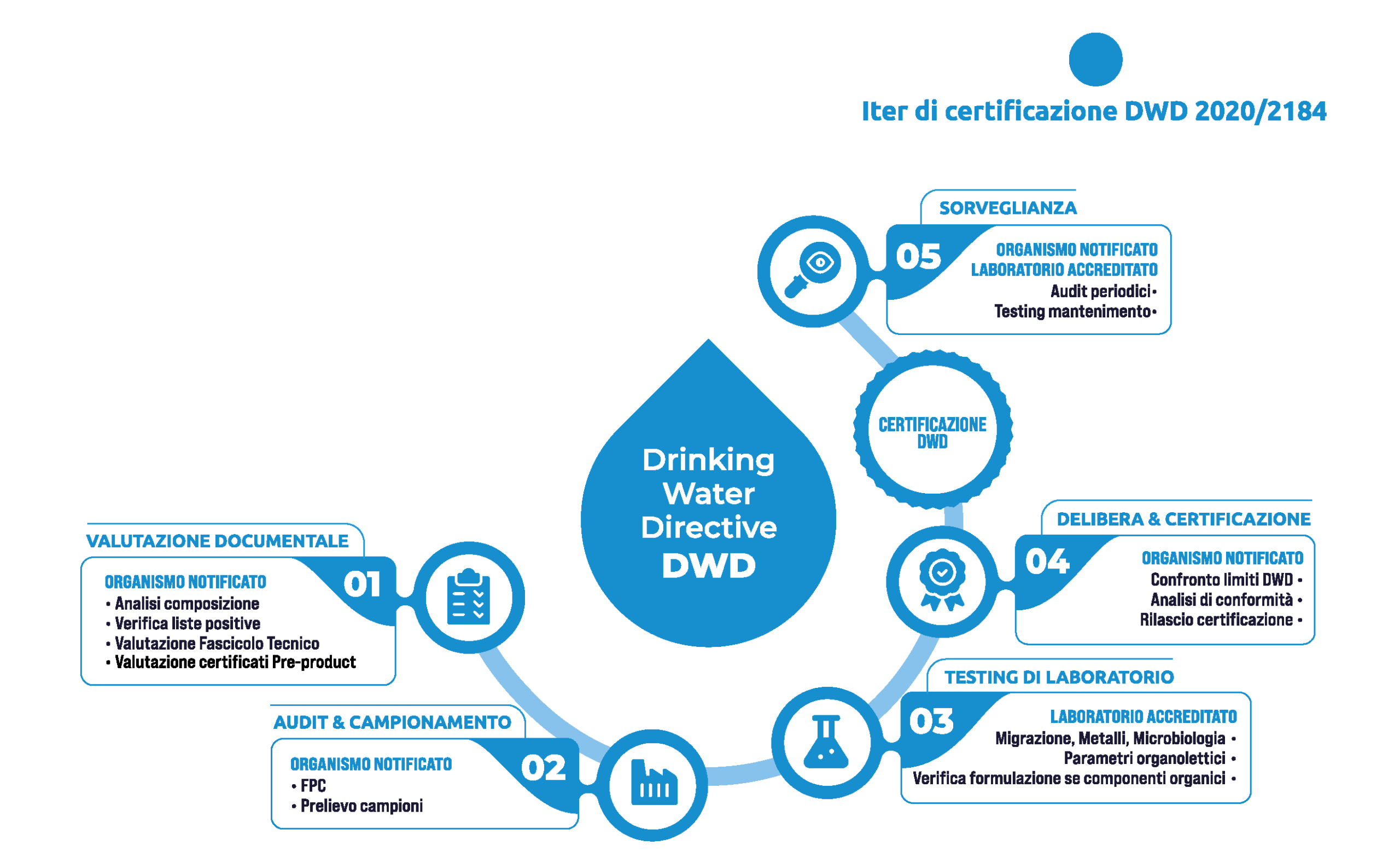 Percorso completo di verifica della conformità, testing, ispezione e rilascio della certificazione ai sensi del Reg. (UE) 2020/2184 per i prodotti finali destinati al contatto con acqua potabile.